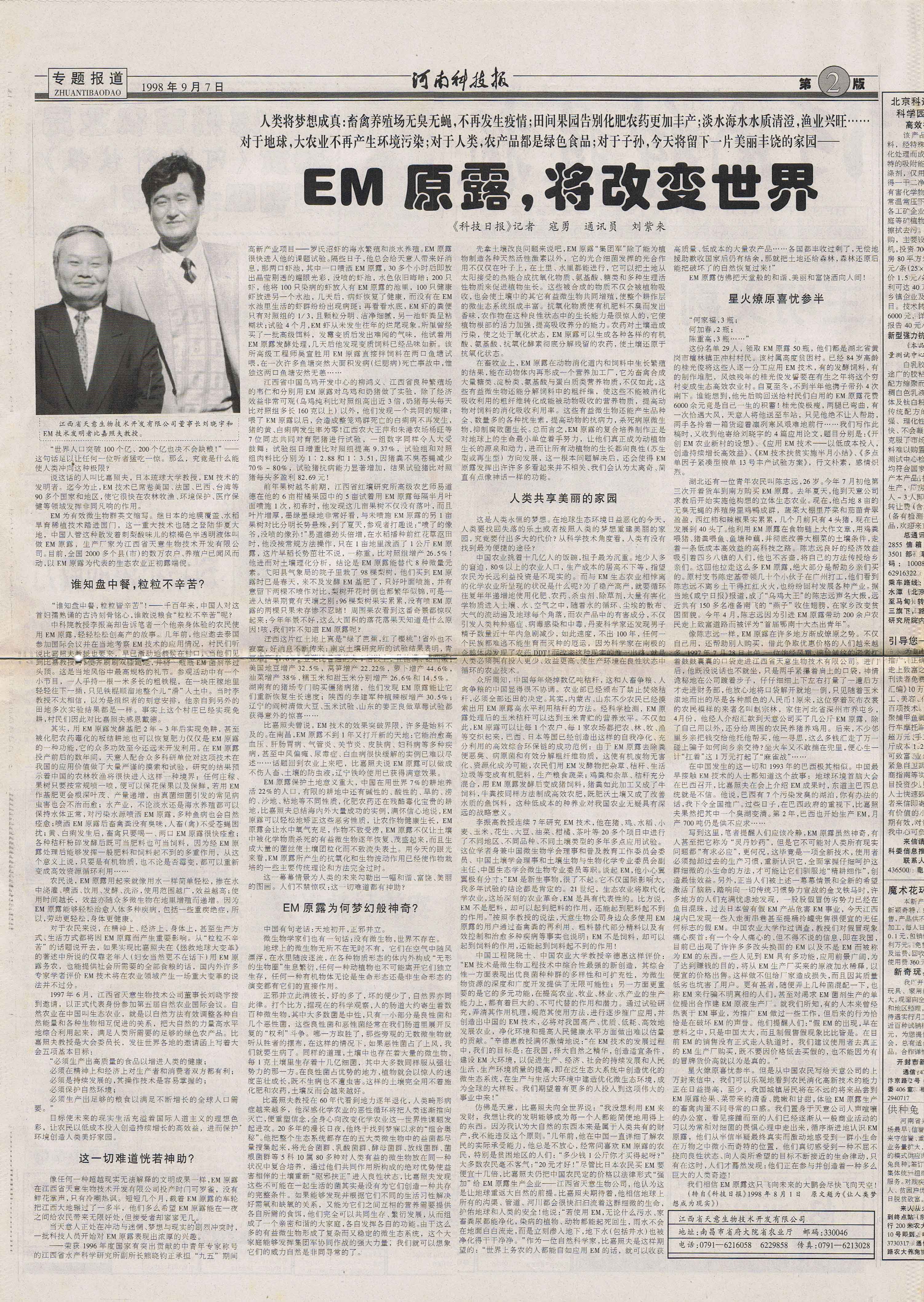 1997年,継《中國畜牧水產(chǎn)報》、《科技日報》、《經(jīng)濟參考報》、《江西日報》等媒體發(fā)表長篇通訊《EM原露正在改變世界》,各省科技、農(nóng)業(yè)報刋均紛紛轉(zhuǎn)載,EM原露在江西最初的使用效果迅速在全國范圍內(nèi)興起了一股熱潮,兩年內(nèi)共簽定縣級代理合同500余家。
